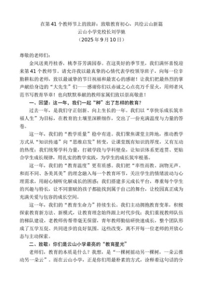 / 领导讲话:20250915云山小学党校长刘学驰:在第41个教师节上的致辞:致敬教育初心,共绘云山新篇