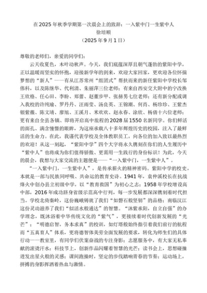 / 领导讲话:20250915徐培顺:在2025年秋季学期第一次晨会上的致辞:一入紫中门一生紫中人