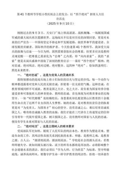 / 领导讲话:20250915许昌良:第41个教师节学校小型庆祝会上的发言:以“四个绝对”担育人大任