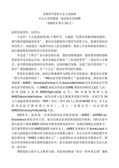 / 领导讲话:20250915中山大学附属第一医院院长肖海鹏:在教师节表彰大会上的致辞
