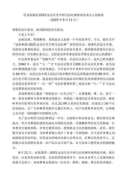 / 领导讲话:20250915在延旅集团2025延安红色半程马拉松赛新闻发布会上的致辞