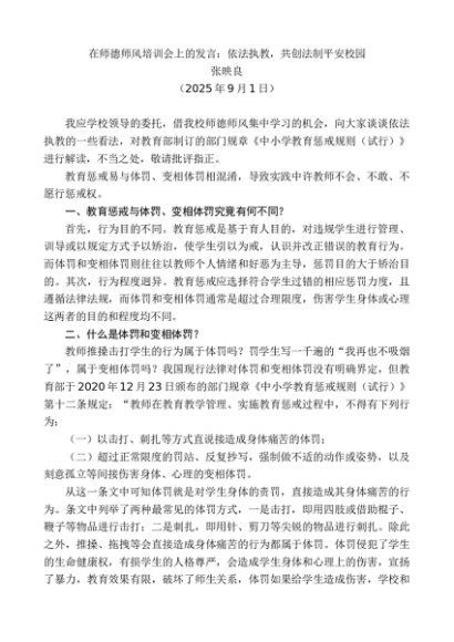 / 领导讲话:20250915张映良:在师德师风培训会上的发言:依法执教,共创法制平安校园