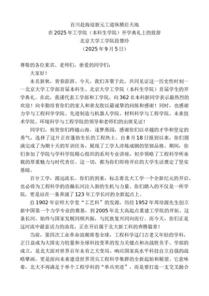 / 领导讲话:20250915在2025年工学院(本科生学院)开学典礼上的致辞:百川赴海迎新元工道纵横启天地