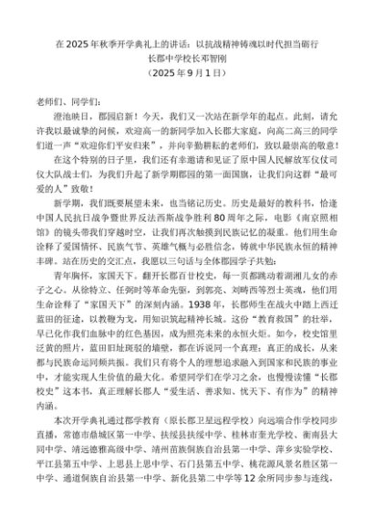 / 领导讲话:20250915长郡中学校长邓智刚:在2025年秋季开学典礼上的讲话:以抗战精神铸魂以时代担当砺行