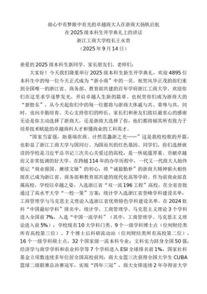 / 领导讲话:20250915在2025级本科生开学典礼上的讲话:做心中有梦眼中有光的卓越商大人在浙商大扬帆启航