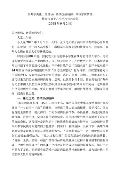 / 领导讲话:20250915株洲市第十八中学校长孙金花:在开学典礼上的讲话:赓续抗战精神,厚植家国情怀