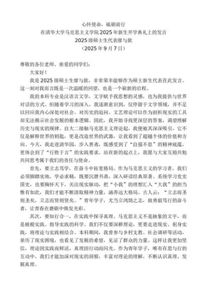 / 领导讲话:20250915在清华大学马克思主义学院2025年新生开学典礼上的发言:心怀使命,砥砺前行