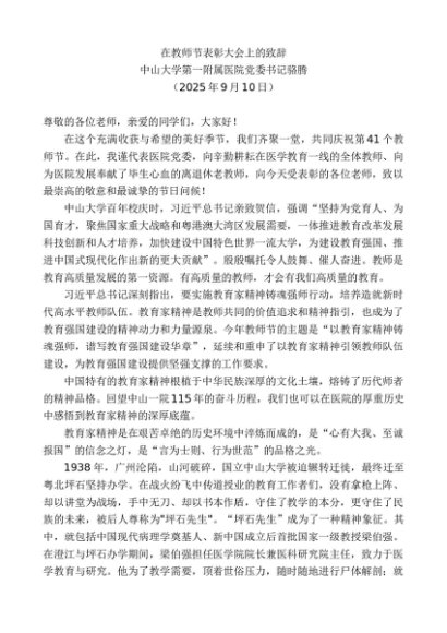 / 领导讲话:20250915中山大学第一附属医院党委书记骆腾:在教师节表彰大会上的致辞