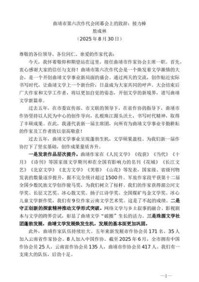 / 领导讲话:20250915敖成林:曲靖市第六次作代会闭幕会上的致辞:接力棒
