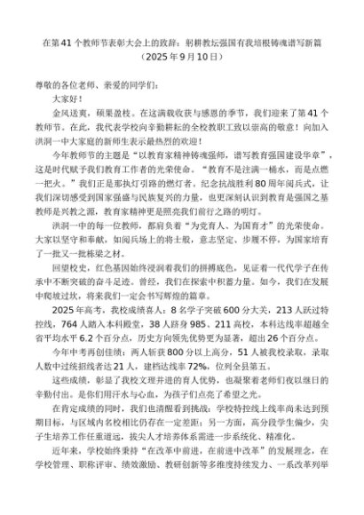 / 领导讲话:20250915在第41个教师节表彰大会上的致辞:躬耕教坛强国有我培根铸魂谱写新篇