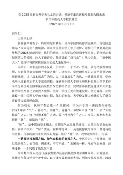 / 领导讲话:20250915浙江中医药大学校长陈忠:在2025级新生开学典礼上的讲话:循脉守正启新程岐黄薪火照未来