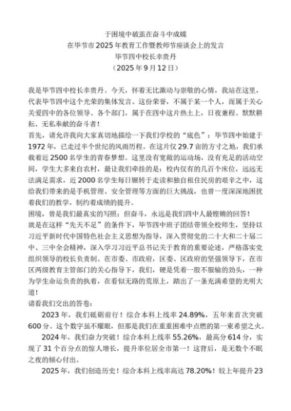/ 领导讲话:20250915在毕节市2025年教育工作暨教师节座谈会上的发言:于困境中破茧在奋斗中成蝶