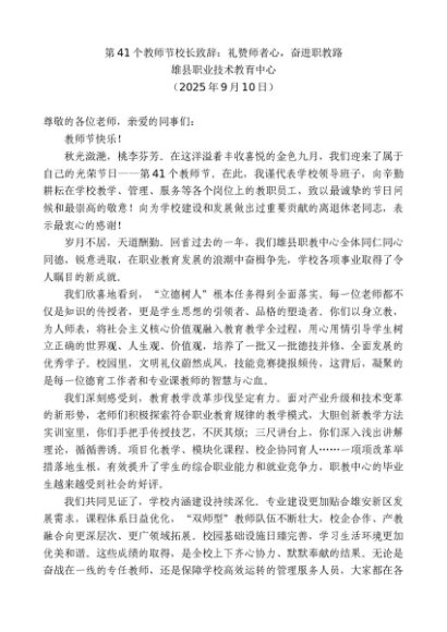 领导讲话:20250915雄县职业技术教育中心:第41个教师节校长致辞:礼赞师者心,奋进职教路