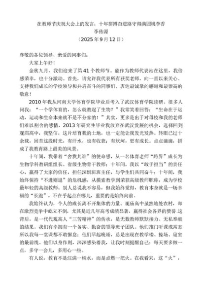 / 领导讲话:20250915李传源:在教师节庆祝大会上的发言:十年拼搏奋进路守得满园桃李香