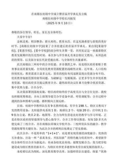 / 领导讲话:20250915南楂拉初级中学校长冯振发:在南楂拉初级中学成立暨首届开学典礼发言稿