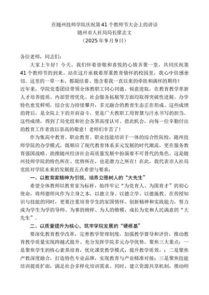 / 领导讲话:20250915随州市人社局局长廖志文:在随州技师学院庆祝第41个教师节大会上的讲话