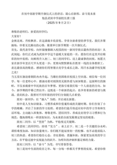 领导讲话:20250915勉县武侯中学副校长唐三强:在初中部新学期升旗仪式上的讲话:凝心启新程,奋斗筑未来