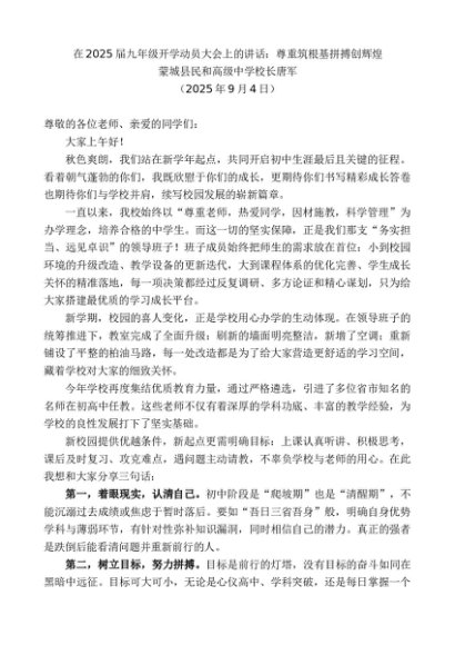 领导讲话:20250915蒙城县民和高级中学校长唐军:在2025届九年级开学动员大会上的讲话:尊重筑根基拼搏创辉煌