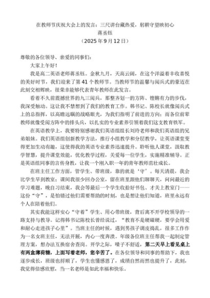 领导讲话:20250915蒋丞钰:在教师节庆祝大会上的发言:三尺讲台藏热爱,躬耕守望映初心