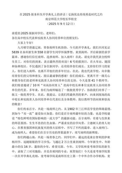 / 领导讲话:20250915南京师范大学校长华桂宏:在2025级本科生开学典礼上的讲话|弘扬优良传统勇赴时代之约