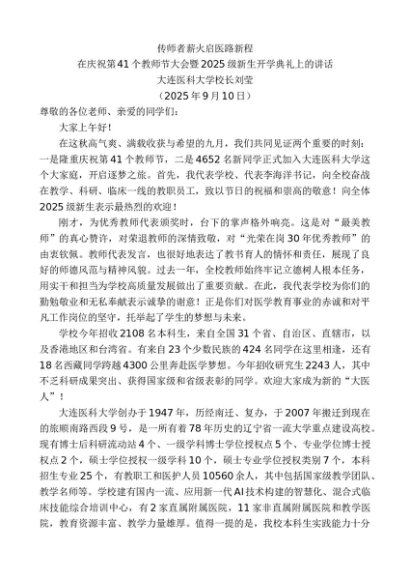 / 领导讲话:20250915在庆祝第41个教师节大会暨2025级新生开学典礼上的讲话:传师者薪火启医路新程