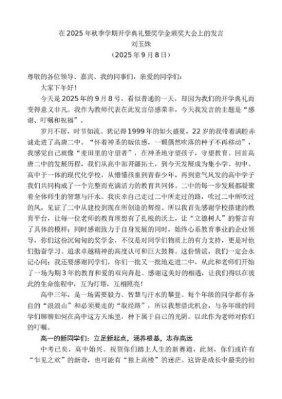 / 领导讲话:20250915刘玉姝:在2025年秋季学期开学典礼暨奖学金颁奖大会上的发言