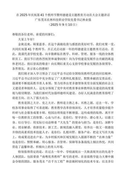/ 领导讲话:20250915广东茂名农林科技职业学院党委书记林业强:在庆祝教师节暨师德建设主题教育月动员大会主题讲话