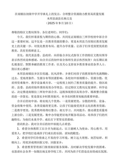 领导讲话:20250915木邦县副县长杨文良:在南楂拉初级中学开学典礼上的发言:合理整合资源助力教育高质量发展