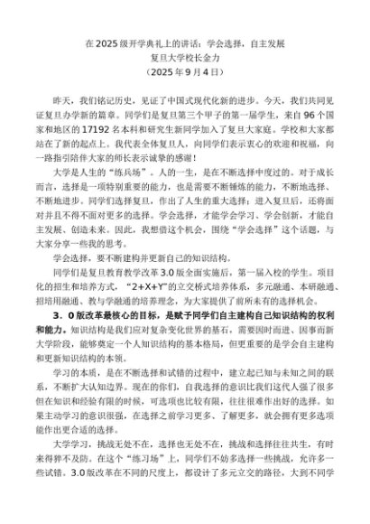 / 领导讲话:20250915复旦大学校长金力:在2025级开学典礼上的讲话:学会选择,自主发展