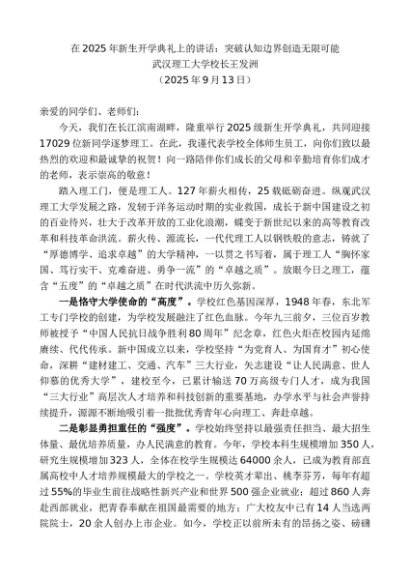 / 领导讲话:20250915武汉理工大学校长王发洲:在2025年新生开学典礼上的讲话:突破认知边界创造无限可能