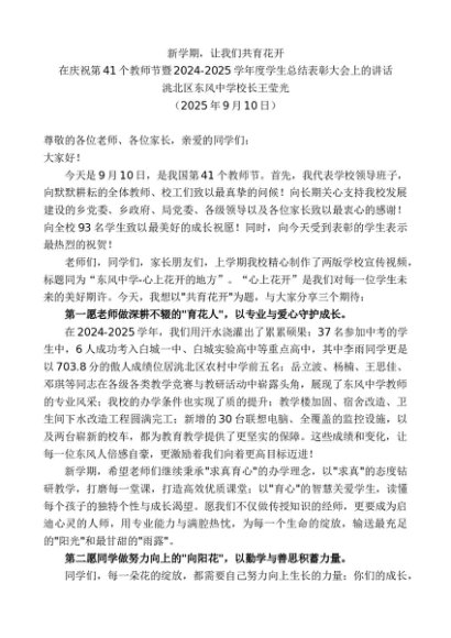 / 领导讲话:20250915在庆祝第41个教师节暨2024-2025学年度学生总结表彰大会上的讲话:新学期,让我们共育花开