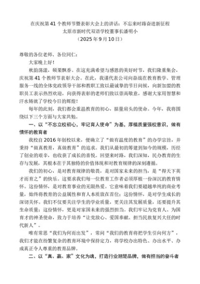 领导讲话:20250915太原市新时代双语学校董事长潘明小:在庆祝第41个教师节暨表彰大会上的讲话:不忘来时路奋进新征程