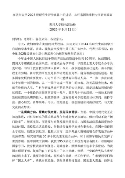 领导讲话:20250915四川大学校长汪劲松:在四川大学2025级研究生开学典礼上的讲话:心怀家国挑重担专注研究攀高峰