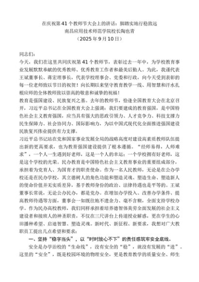 / 领导讲话:20250915南昌应用技术师范学院校长陶也青:在庆祝第41个教师节大会上的讲话:脚踏实地行稳致远
