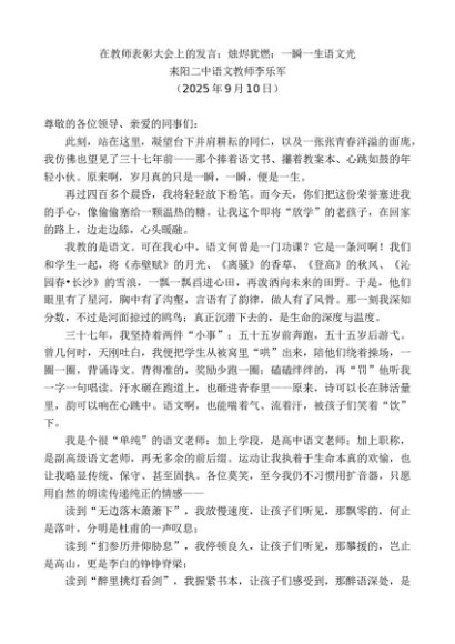 领导讲话:20250915耒阳二中语文教师李乐军:在教师表彰大会上的发言:烛烬犹燃:一瞬一生语文光