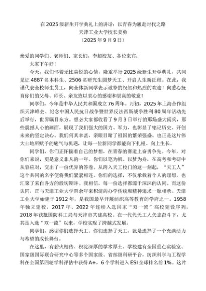领导讲话:20250915天津工业大学校长姜勇:在2025级新生开学典礼上的讲话:以青春为履赴时代之路
