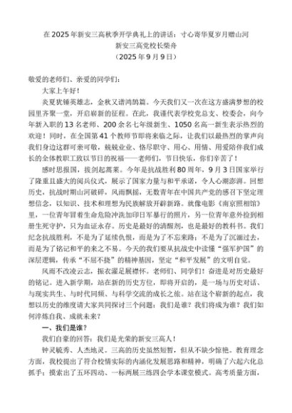 / 领导讲话:20250915新安三高党校长柴舟:在2025年新安三高秋季开学典礼上的讲话:寸心寄华夏岁月赠山河