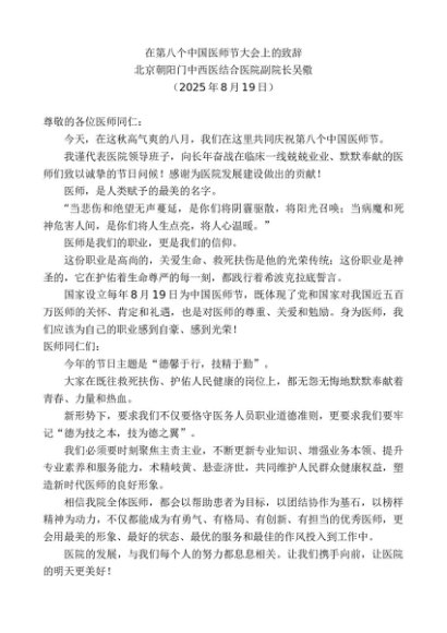 / 领导讲话:20250915北京朝阳门中西医结合医院副院长吴儆:在第八个中国医师节大会上的致辞