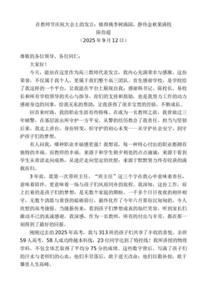 / 领导讲话:20250915陈俭超:在教师节庆祝大会上的发言:植得桃李树满园,静待金秋果满枝
