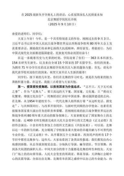 / 领导讲话:20250915北京舞蹈学院院长许锐:在2025级新生开学典礼上的讲话:心系家国深扎人民探索未知