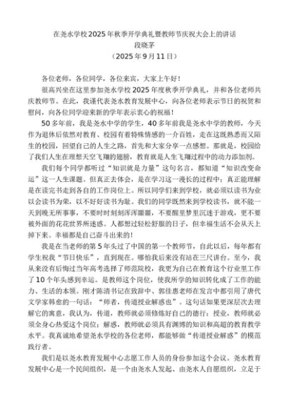 / 领导讲话:20250915段晓茅:在尧水学校2025年秋季开学典礼暨教师节庆祝大会上的讲话