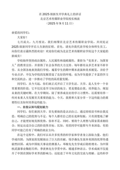/ 领导讲话:20250915北京艺术传媒职业学院校长杨波:在2025级新生开学典礼上的讲话