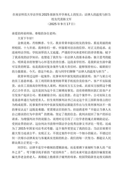 领导讲话:20250930校友代表陈文军:在南京师范大学法学院2025级新生开学典礼上的发言:法律人的温度与担当