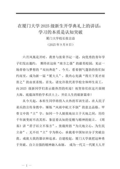 / 领导讲话:20250908在厦门大学2025级新生开学典礼上的讲话:学习的本质是认知突破——厦门大学校长张宗益
