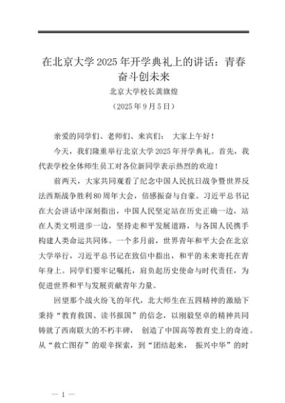 / 领导讲话:20250905在北京大学2025年开学典礼上的讲话:青春奋斗创未来——北京大学校长龚旗煌