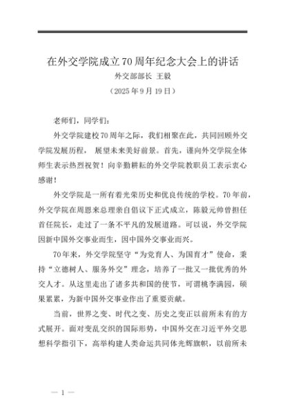 / 领导讲话:20250919在外交学院成立70周年纪念大会上的讲话——外交部部长 王毅