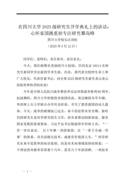 / 领导讲话:20250912在四川大学2025级研究生开学典礼上的讲话:心怀家国挑重担专注研究攀高峰——四川大学校长汪劲松