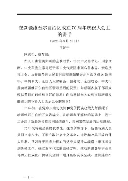 / 领导讲话:20250925在新疆维吾尔自治区成立70周年庆祝大会上的讲话——王沪宁