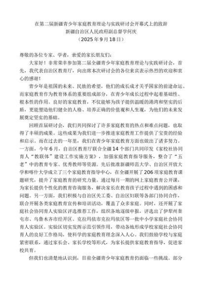 / 领导讲话:20250930新疆自治区人民政府副总督学何庆:在第二届新疆青少年家庭教育理论与实践研讨会开幕式上的致辞