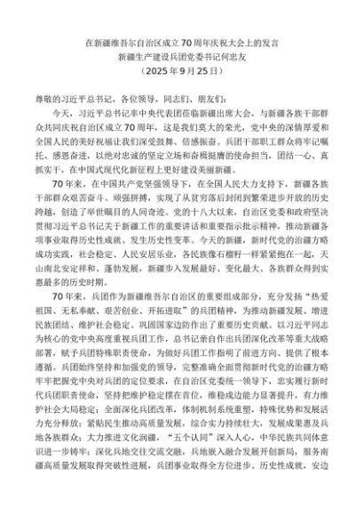 领导讲话:20250930新疆生产建设兵团党委书记何忠友:在新疆维吾尔自治区成立70周年庆祝大会上的发言
